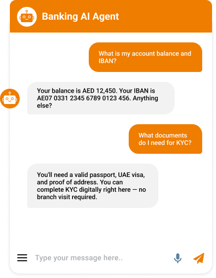 With the Banking AI Agent, Ahmed checked eligibility online, uploaded documents digitally, and received instant updates.