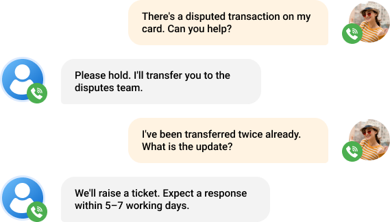 Fatima contacted support regarding a disputed transaction. Responses were delayed, and she experienced multiple handoffs.